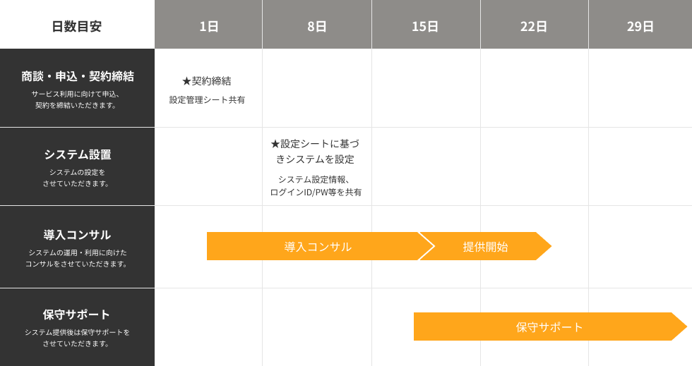 ※上記は、弊社サービスを導入いただく場合の標準的なスケジュールをベースに、仮置きさせていただいております。